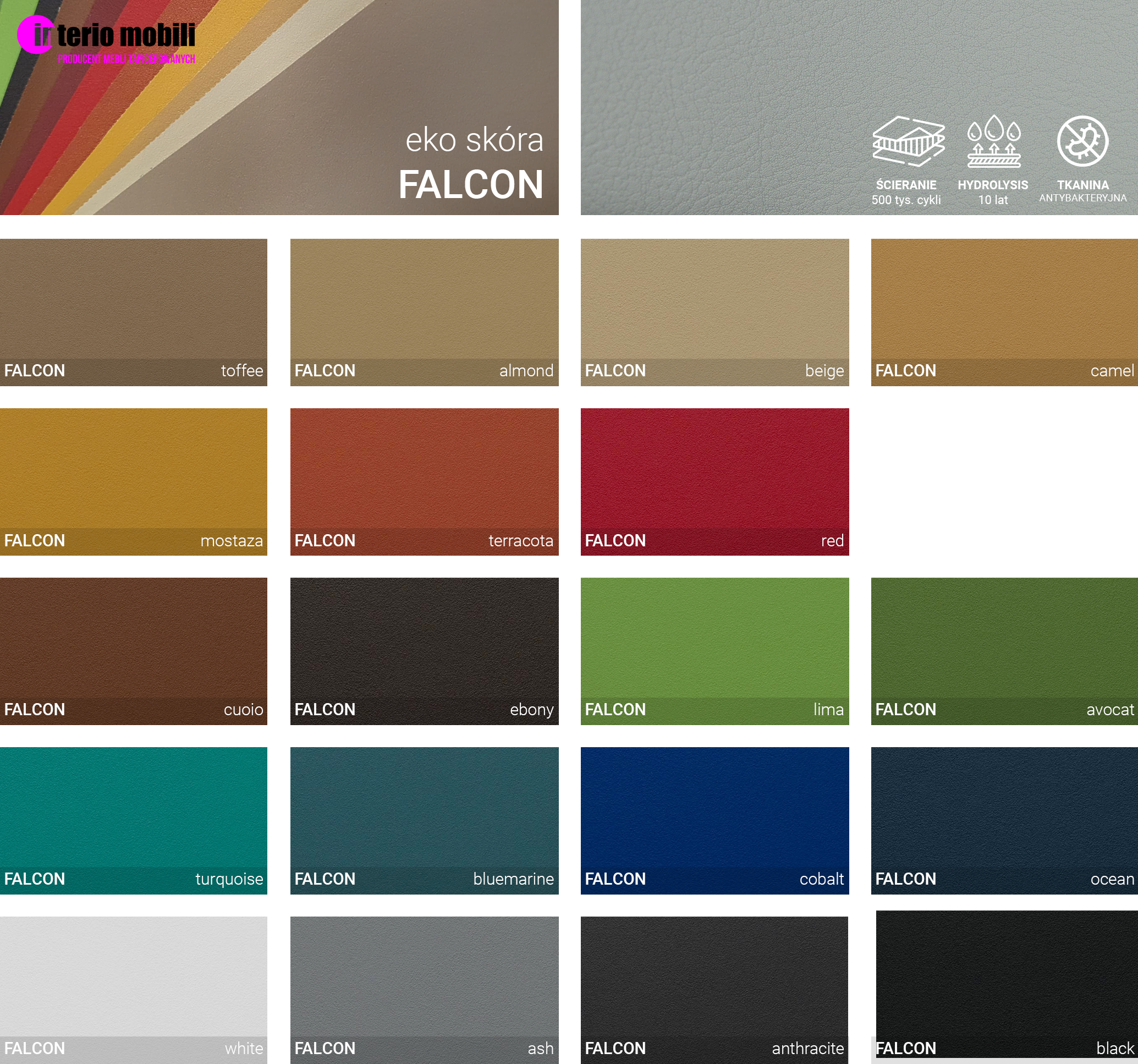 NOWOŚĆ! EKO SKÓRA FALCON - wysokiej jakości eko skóra o gładkiej strukturze, matowym wykońćzeniu i stonowanej kolorystyce. Posiada certufikat trudnopalności oraz higieniczny, ma właściwości antybakteryjne oraz wysoki wskaźnik ścierlaności- 300 tyś cykli. Przeznaczona do placówek medycznych oraz użyteczności publicznej.