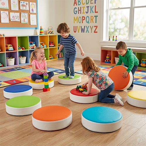 Praktyczne i wygodne poduszki siedziska o średnicy 40 cm, stworzone z myślą o codziennym użytkowaniu w przedszkolach i szkołach. Doskonale sprawdzają się zarówno podczas zajęć edukacyjnych, jak i zabawy na podłodze.